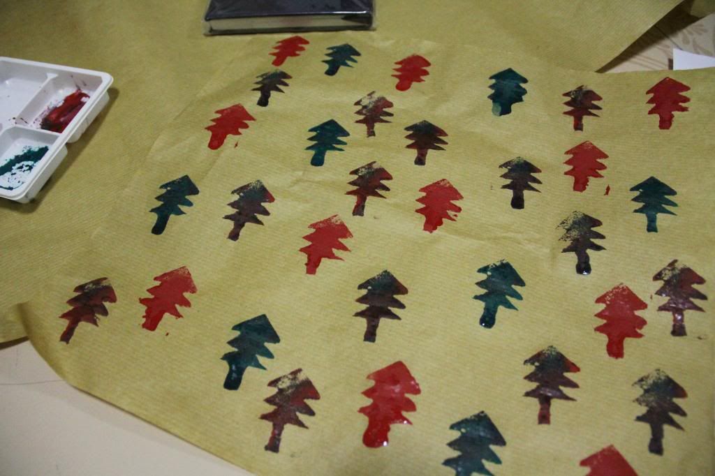 Cut the sponge to a shape you prefer, as for me, i cut into a Christmas Tree. I apply paint on the sponge and gently pressed it on the brown paper. If you want to have the edgy feel, pressed it down softly but if you want it to be more complete, pressed it down with a little more force.