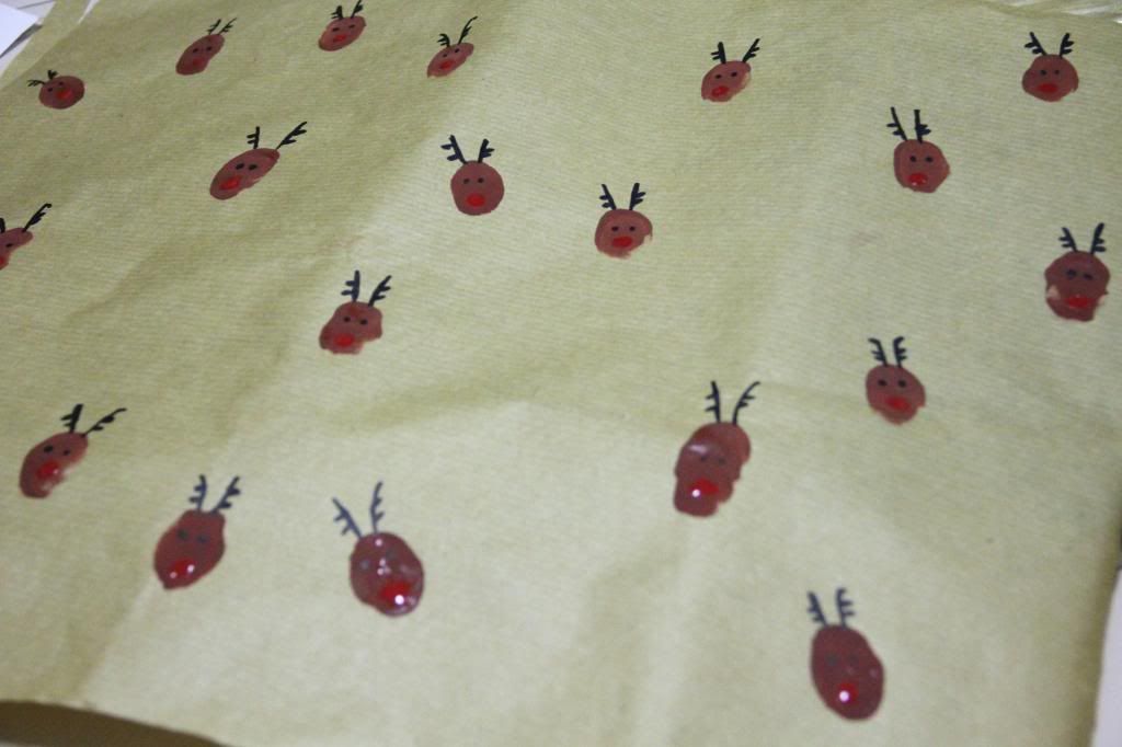 Choose the correct colour for the rein deer skin tone, next apply the paint on your thumbprint, and stamp it on the brown paper. Using the tip of the brush, apply it with red paint and dot on the thumbprint, where you want your rein deer nose to be place.